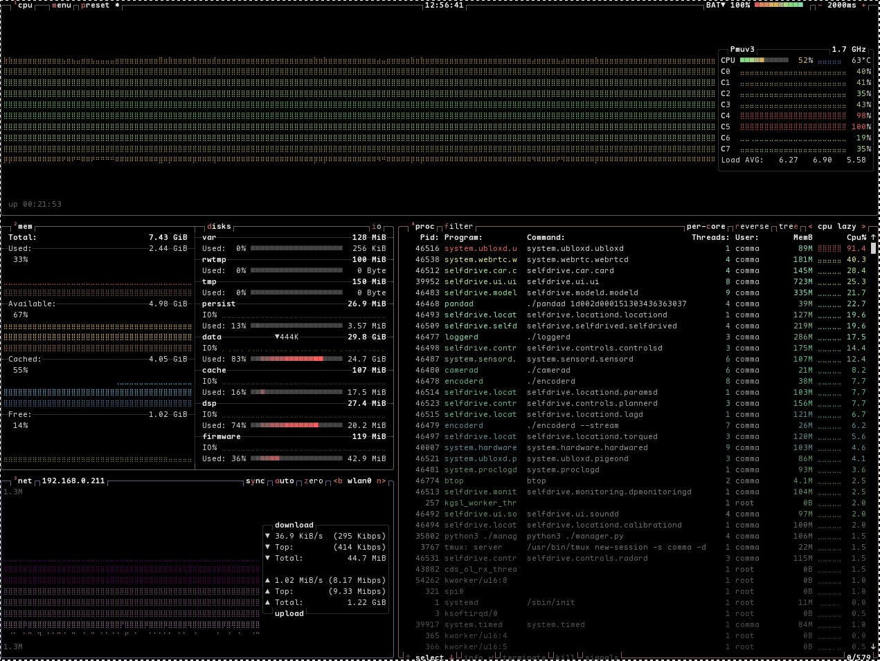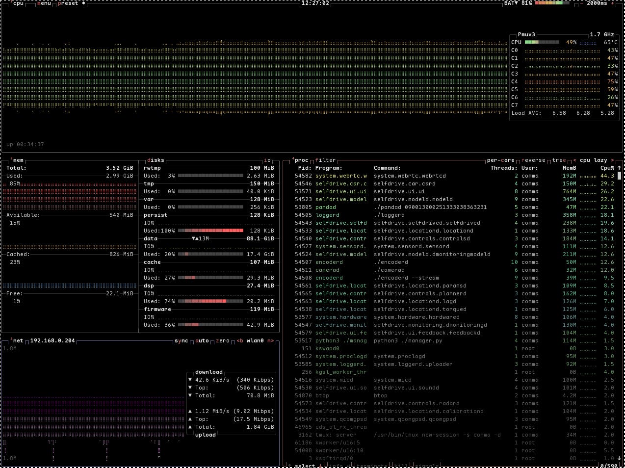 RAM: o3XL 配備了 8GB RAM,是 C3X (4GB RAM) 的兩倍。這個優勢在 openpilot 系統更新後變得極為明顯。根據測試,在 4GB 的 comma3 上安裝 dragonpilot 0.10.1 (使用 dashy 下),記憶體使用率會高達 85%(對比 0.10.0 的 64%),這主要是因為新的 raylib UI 佔用了更多資源 (從 184MB 暴增到 764MB)。