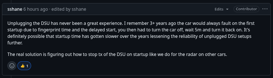 理論上,只要將車輛的 DSU 接頭拔除 (Disconnect DSU),openpilot 就會接手,開始發送它認為正確的 CAN 訊號來控制車輛,同時防止儀表板亮起錯誤碼。然而,這個方法在實際應用中似乎問題多多,穩定性並不理想。